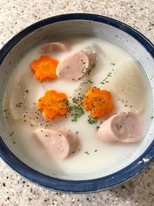 さかなの日、深海と外国の海、その他2025年10月26日2025年10月26日 レシピ:魚肉ソーセージのクリームシチュー スープ感覚で頂く 軽ーいシチューです。 魚肉ソーセージからダシがあまり出ませんから、軽い素材で(お芋類は避けて) 人参と大根をスープで煮て、ホワイトソースを溶かし込みます。ホワイトソースは少し作り置きしておくと とろみが欲しい時に便利です。 もちろん市販品でも。 胃が疲れていても良い様な優しい味に仕上がりました。 大貫 圭
